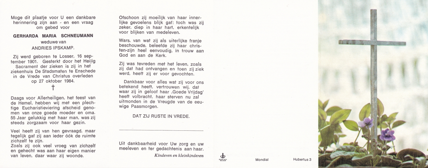 SCHNEUMANN, Berendina Francisca, geboren op 12-11-1896 te Losser, overleden op 10-9-1988 te Enschede, ziekenhuis op 91-jarige leeftijd, begraven op 14-9-1988 te Lonneker.
