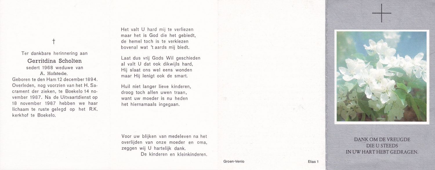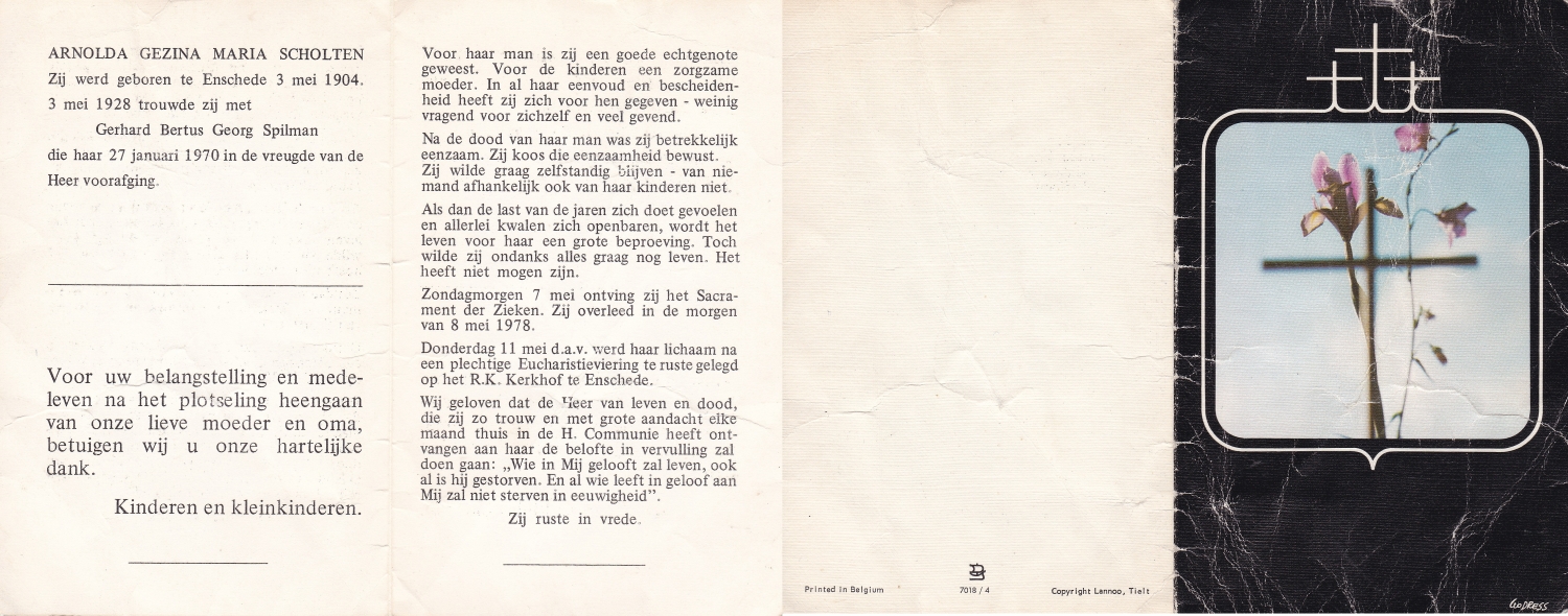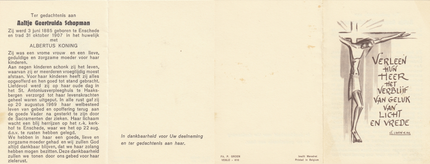 SCHOLTEN, Geertruida Grada, geboren op 24-12-1901 te Enschede, overleden op 7-12-1969 te Enschede, ziekenhuis op 67-jarige leeftijd, begraven op 11-12-1969 te Enschede.