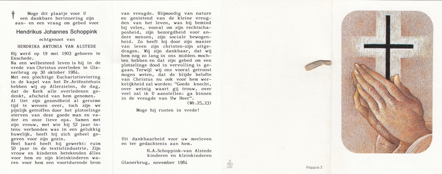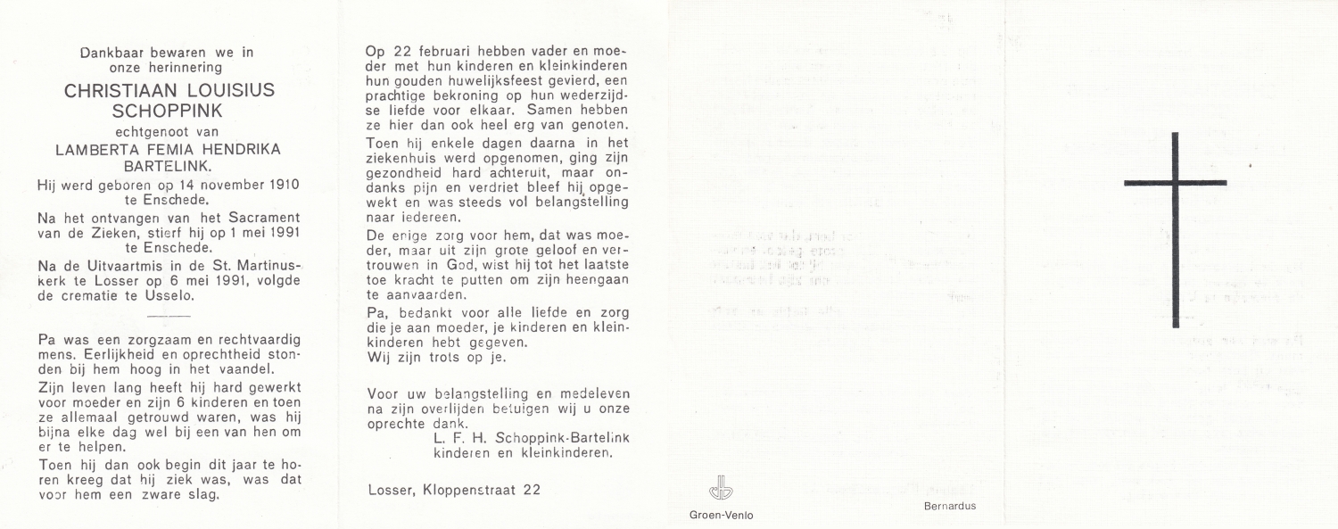 SCHURINK, Hendrikus Johannes, geboren op 5-11-1914 te Enschede, overleden op 26-5-1992 te Enschede op 77-jarige leeftijd, begraven op 1-6-1992 te Enschede.