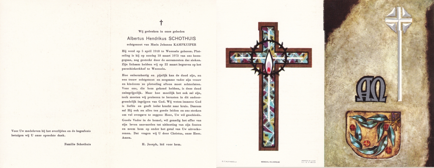 SCHOTHUIS, Johannes Gerhardus Leo, geboren op 11-4-1909 te Hengelo, overleden op 26-5-1967 te Hengelo op 58-jarige leeftijd, begraven op 29-5-1967 te Hengelo.