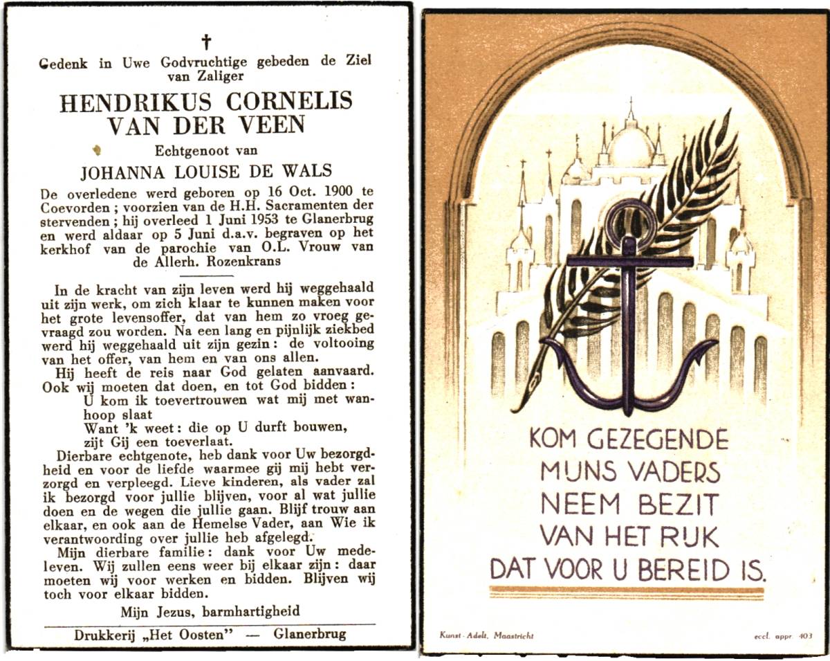 VEEN, van der, Hendrikus Cornelis, geboren op 16-10-1900 te Coevorden, overleden op 1-6-1953 te Glanerbrug op 52-jarige leeftijd, begraven op 5-6-1953 te Glanerbrug.