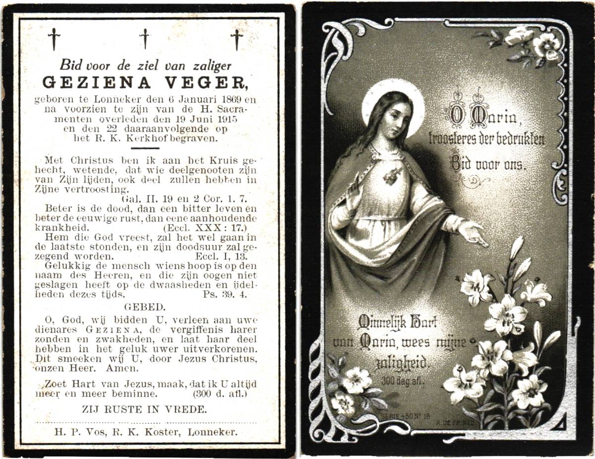 VEGER, Geziena, geboren op 06-01-1869 te Lonneker, overleden op 19-6-1915 op 46-jarige leeftijd, begraven op 22-6-1915 te Lonneker.