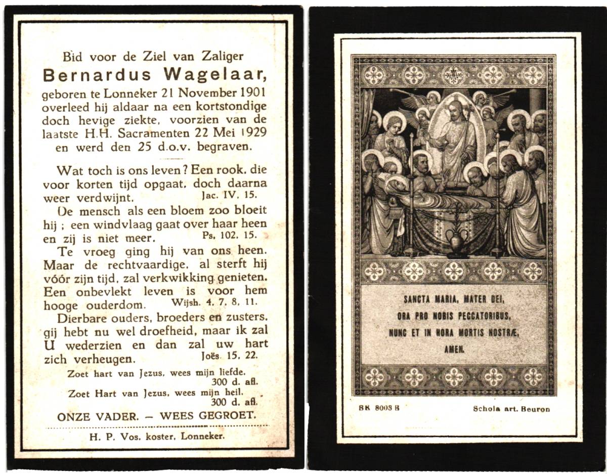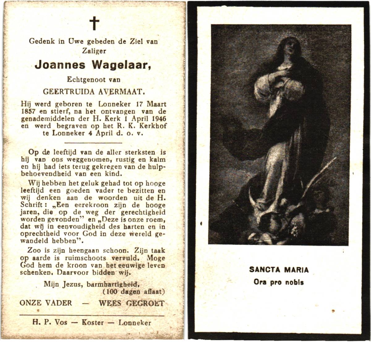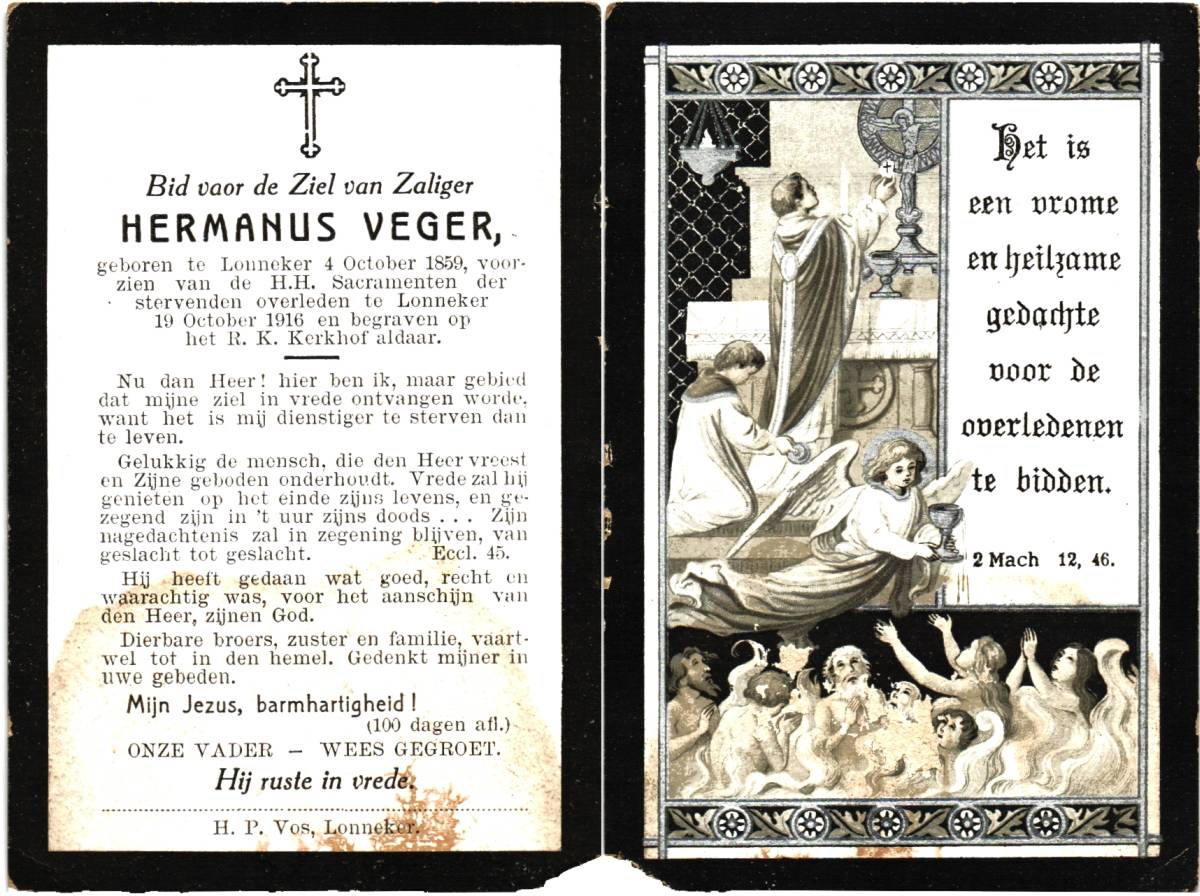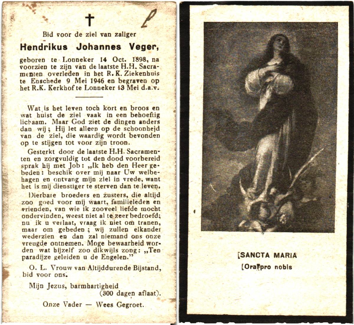 VEGER, Hendrikus Johannes, geboren op 14-10-1898 te Lonneker, overleden op 9-5-1946 te Enschede, ziekenhuis op 47-jarige leeftijd, begraven op 13-5-1946 te Lonneker.