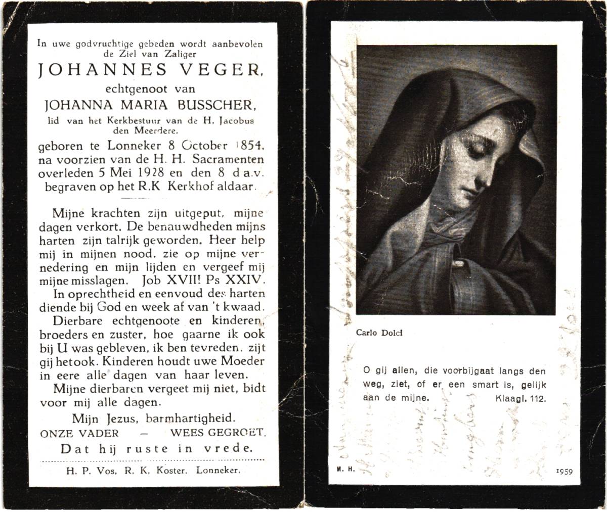 VEGER, Johannes, geboren op 08-10-1854 te Lonneker, overleden op 5-5-1928 op 73-jarige leeftijd, begraven op 8-5-1928 te Lonneker.