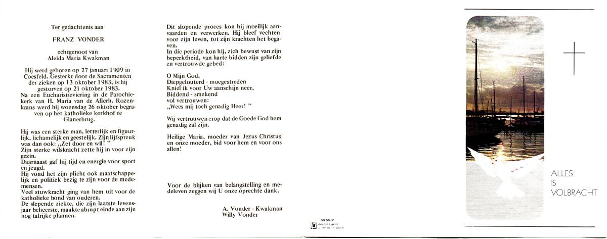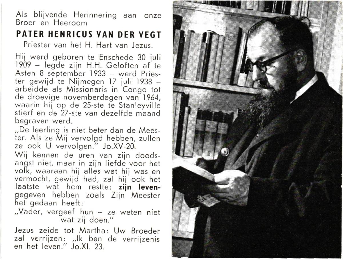 VEGT, van der, Henricus, geboren op 30-7-1909 te Enschede, overleden op nov. 1964 te Stanleyville, Kongo op 55-jarige leeftijd.