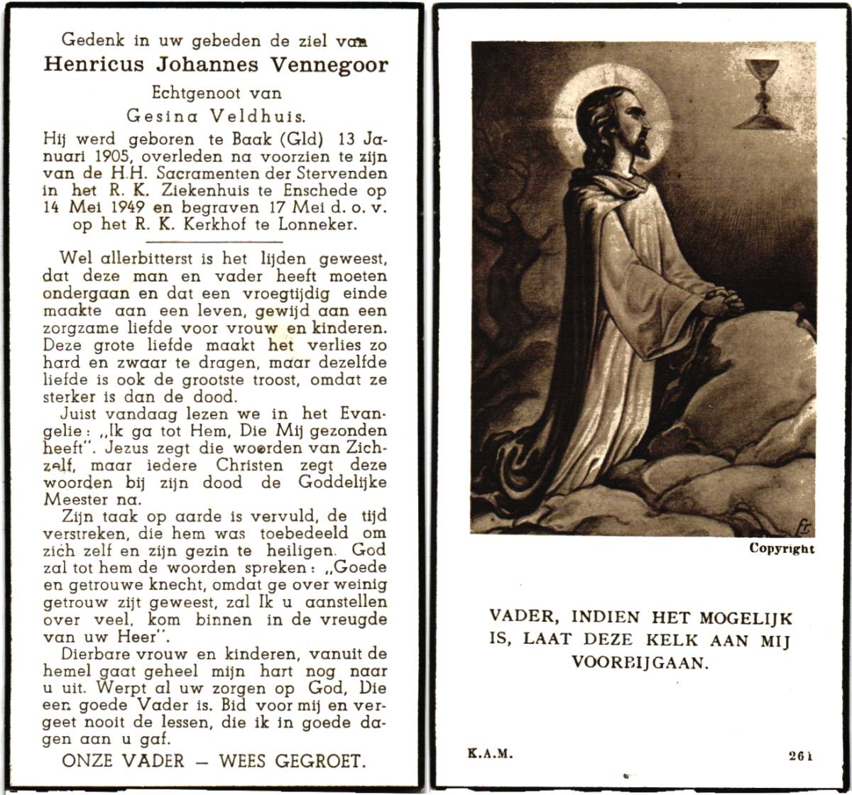 VENNEGOOR, Henricus Johannes, geboren op 13-1-1905 te Baak, Glg, overleden op 14-5-1949 te Enschede, ziekenhuis op 44-jarige leeftijd, begraven op 17-5-1949 te Lonneker.