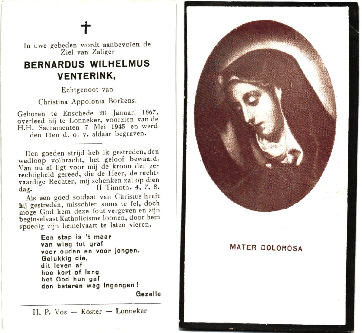 VENTERINK, Bernardus Wilhelmus, geboren op 20-01-1867 te Enschede, overleden op 7-5-1945 te Lonneker op 78-jarige leeftijd, begraven op 11-5-1945 te Lonneker.
