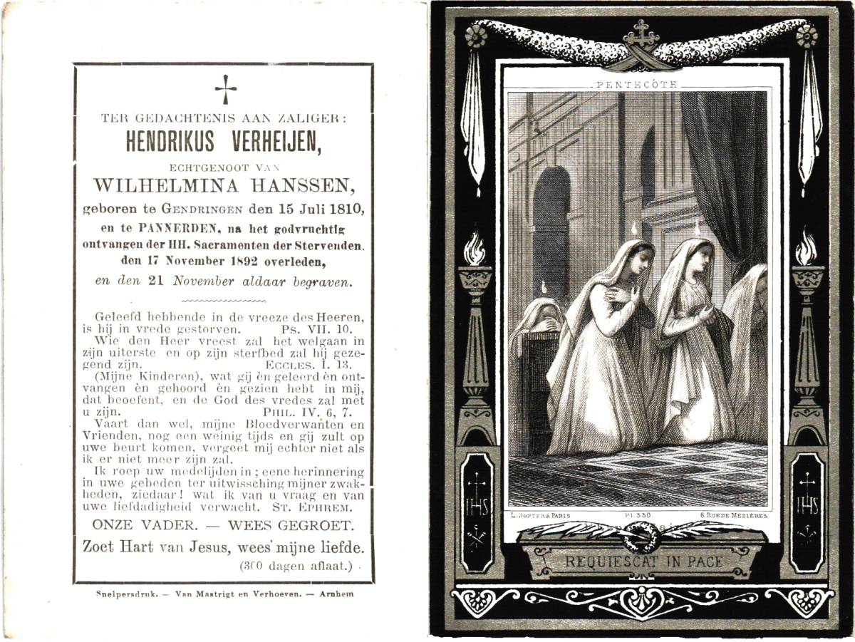 VERHEIJEN, Hendrikus, geboren op 15-07-1810 te Gendringen, overleden op 17-11-1892 te Gendringen op 82-jarige leeftijd, begraven op 21-11-1892 te Gendringen.