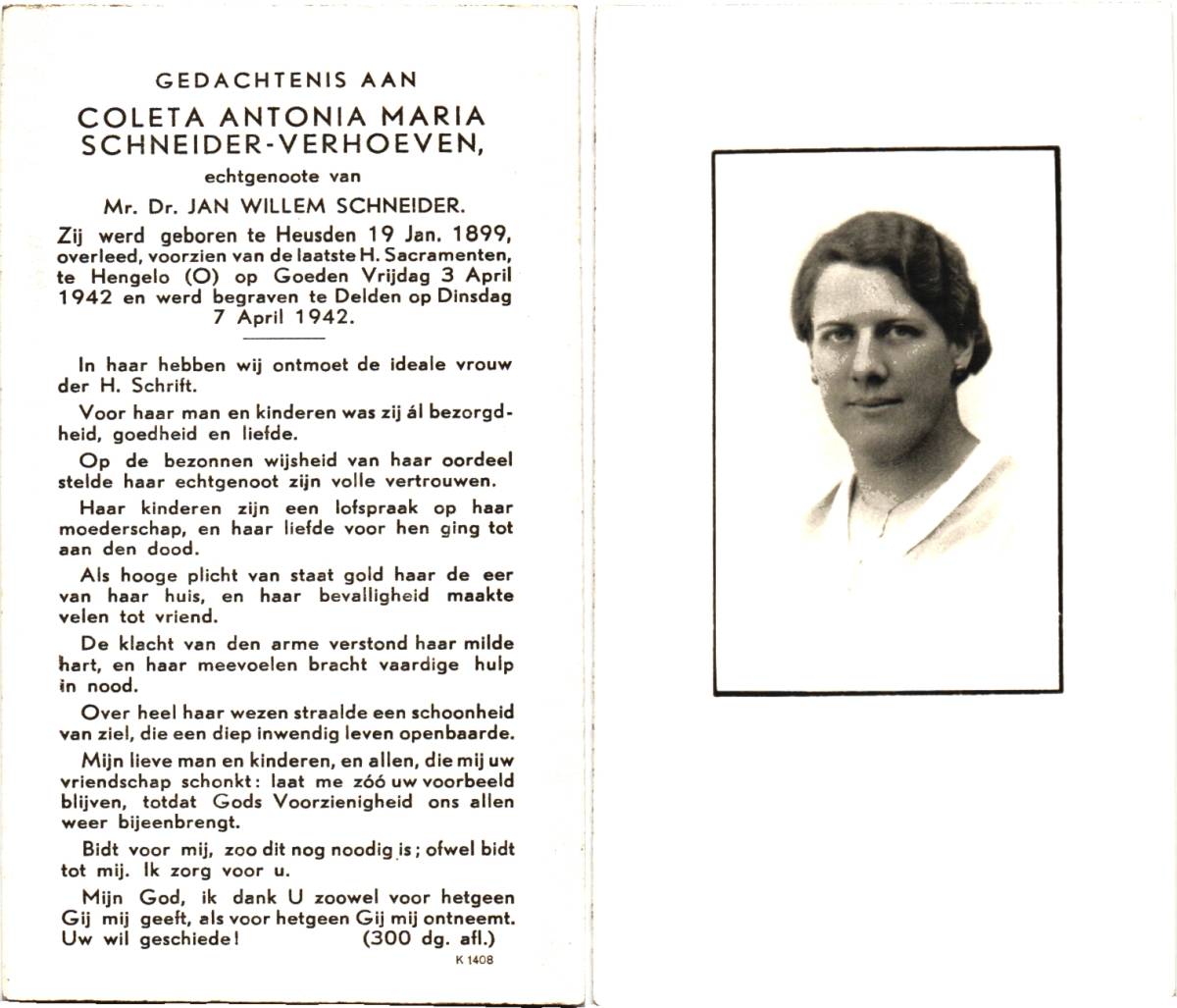 VERHOEVEN, Coleta Antonia Maria, geboren op 19-01-1899 te Heusden, overleden op 3-4-1942 te Hengelo op 43-jarige leeftijd, begraven op 7-4-1942 te Delden.