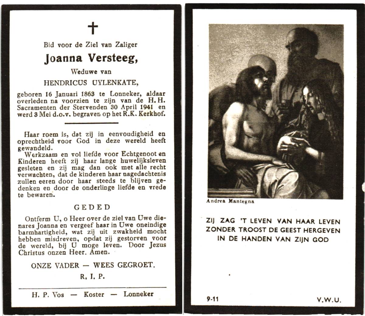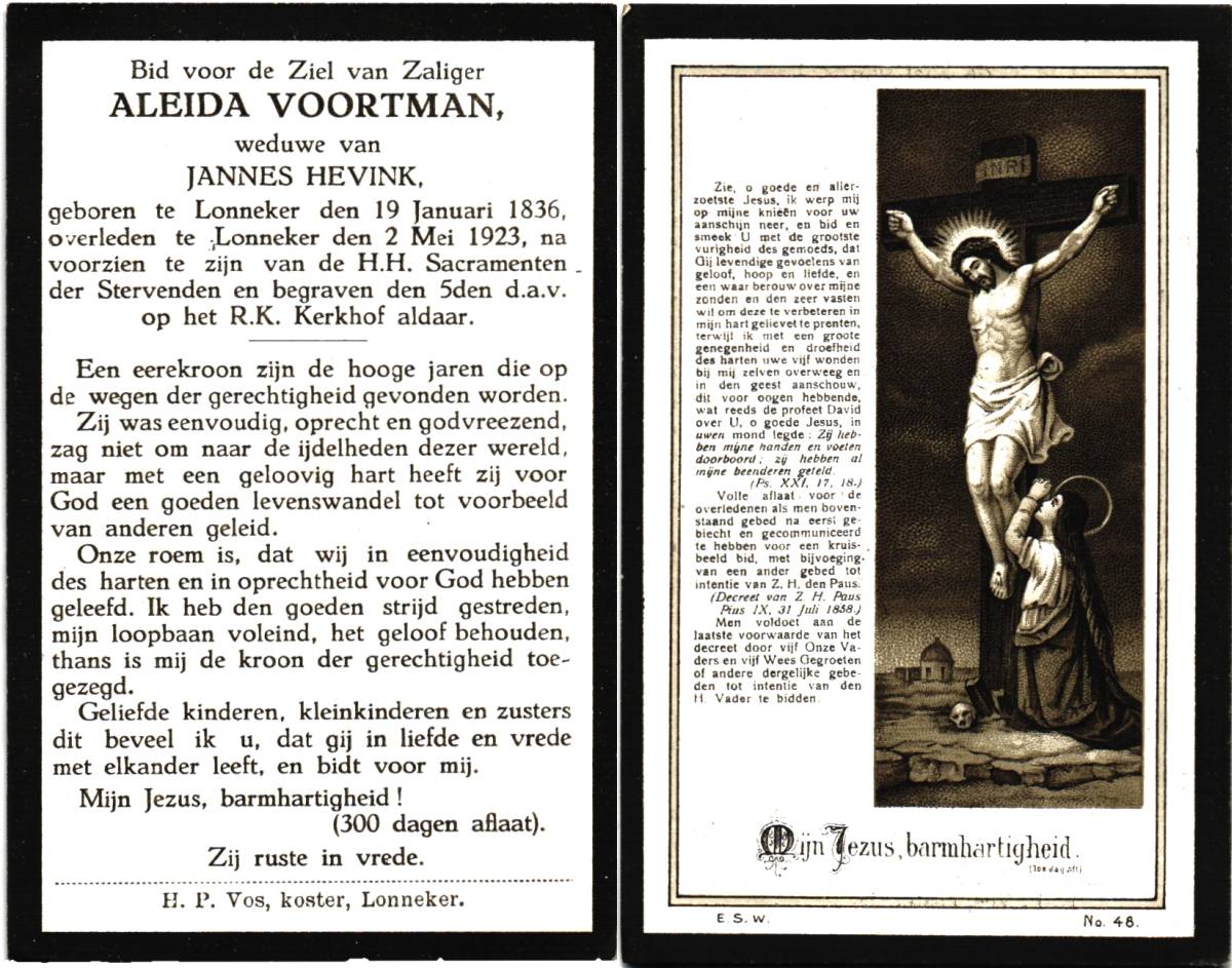 VOORTMAN, Aleida, geboren op 19-01-1836 te Lonneker, overleden op 2-5-1923 te Lonneker op 87-jarige leeftijd, begraven op 5-5-1923 te Lonneker.