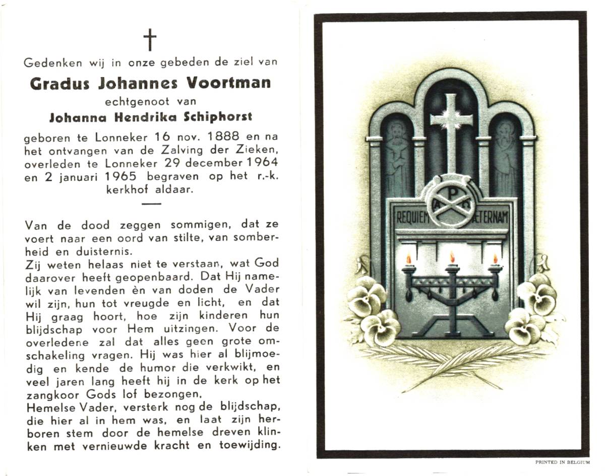 VOORTMAN, Gradus Johannes, geboren op 16-12-1888 te Lonneker, overleden op 29-12-1964 te Lonneker op 76-jarige leeftijd, begraven op 2-1-1965 te Lonneker.