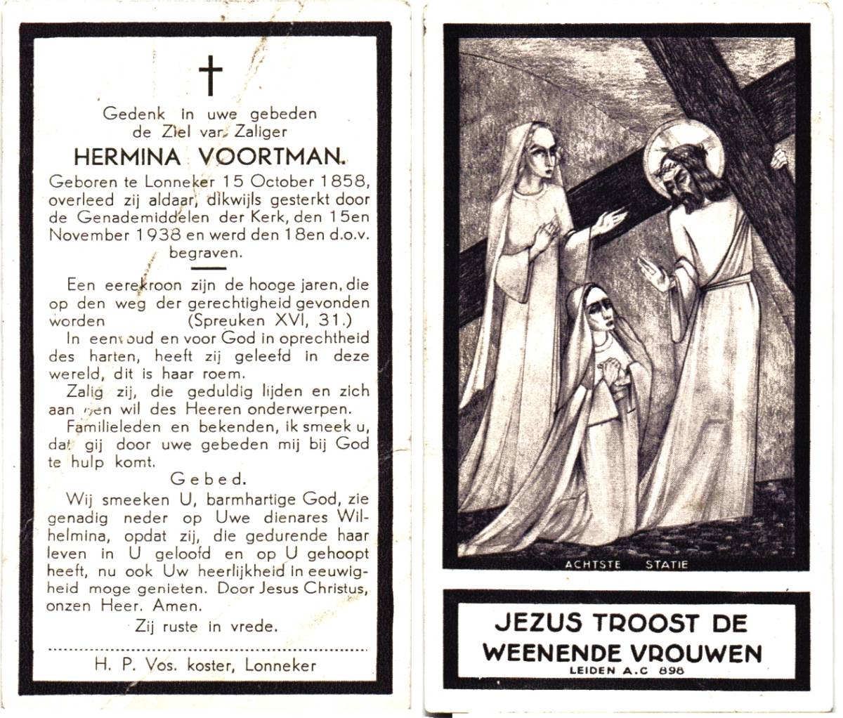VOORTMAN, Hermina, geboren op 15-10-1858 te Lonneker, overleden op 15-11-1938 te Lonneker op 80-jarige leeftijd, begraven op 18-11-1938 te Lonneker.