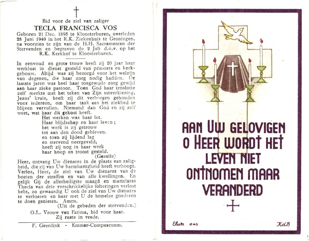 VOS, Tecla Francisca, geboren op 21-12-1895 te Kloosterburen, overleden op 28-6-1949 te Groningen, ziekenhuis op 53-jarige leeftijd, begraven op 2-7-1949 te Kloosterburen.