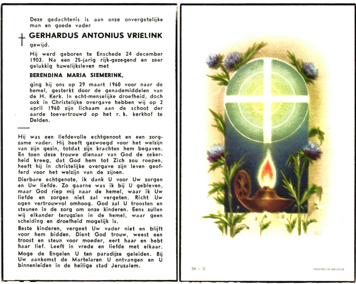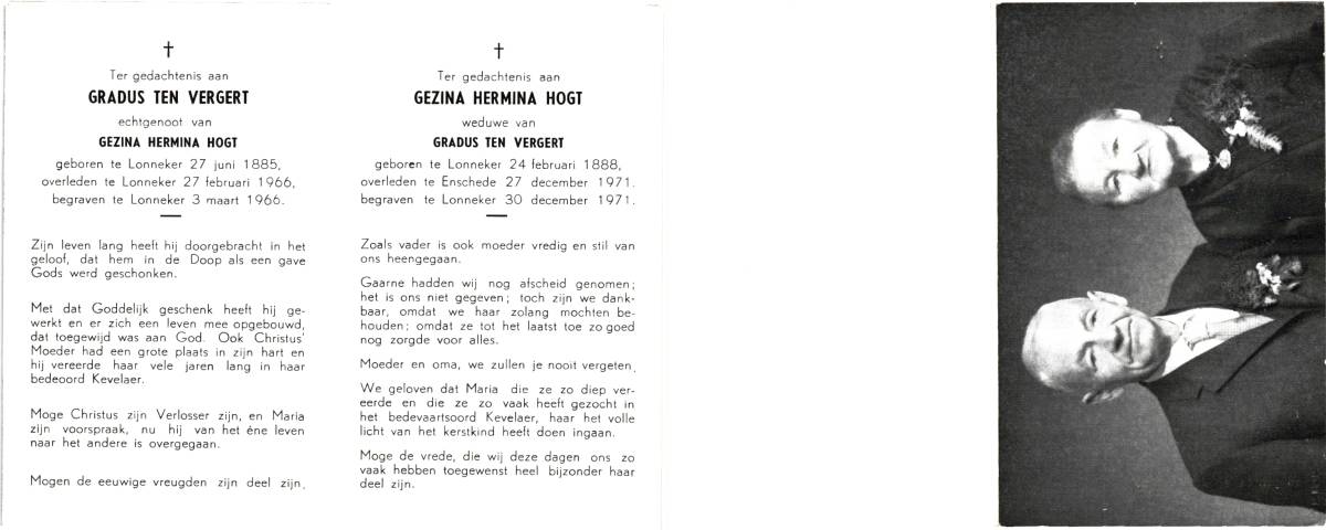 VERGERT, ten, Gradus, geboren op 27-06-1885 te Lonneker, overleden op 27-2-1966 te Lonneker op 80-jarige leeftijd, begraven op 3-3-1966 te Lonneker.