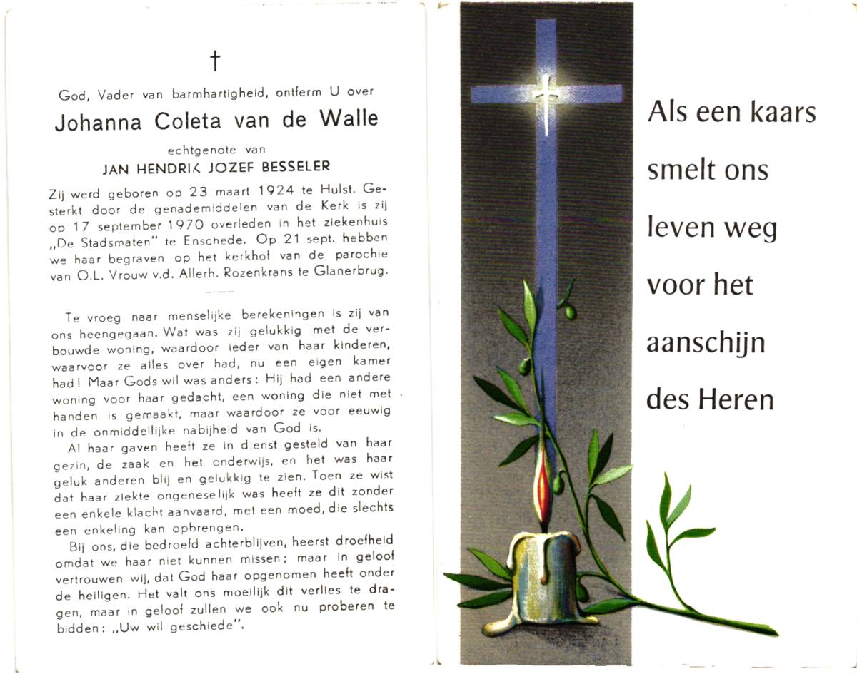 WALLE, van de, Johanna Coleta, geboren op 23-3-1924 te Hulst, overleden op 17-9-1970 te Enschede op 46-jarige leeftijd, begraven op 21-9-1970 te Glanerbrug.