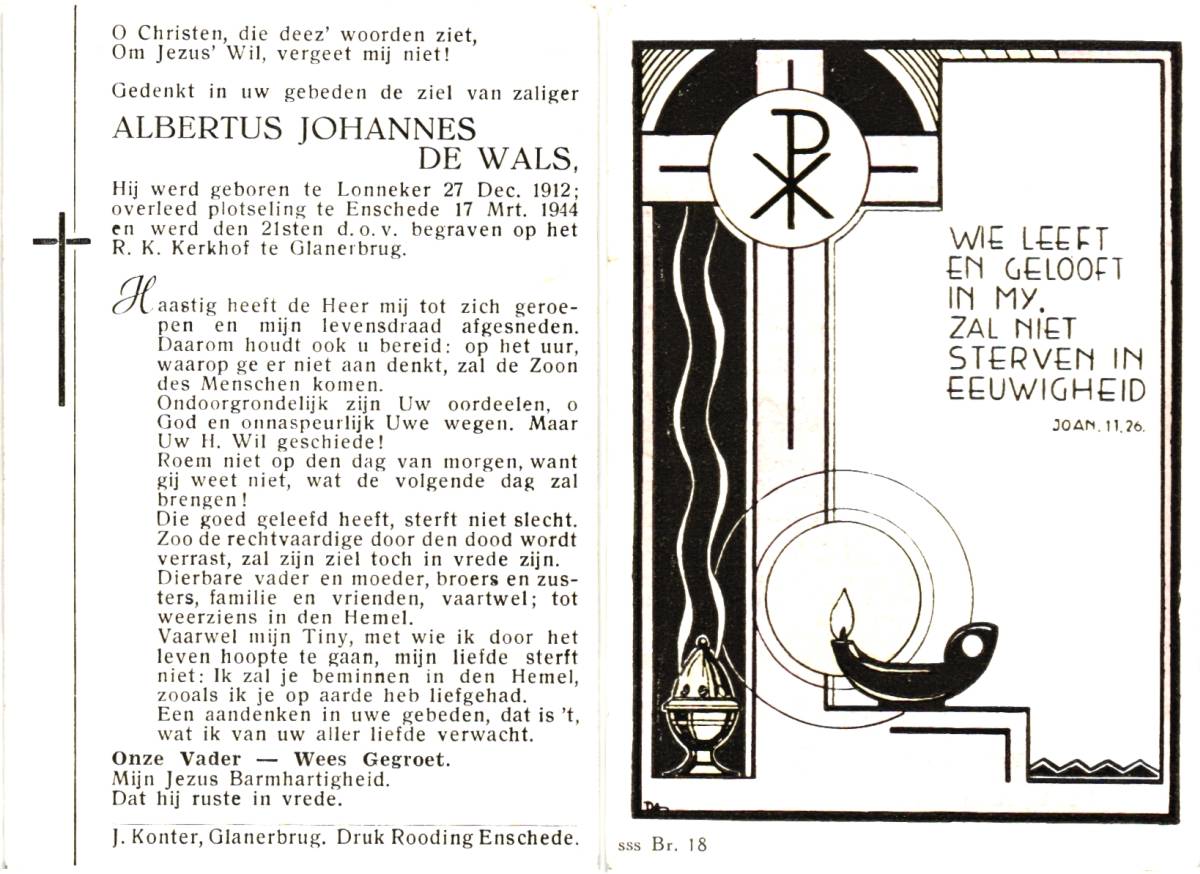 WALS, de, Albertus Johannes, geboren op 27-12-1912 te Lonneker, overleden op 17-3-1944 te Enschede op 31-jarige leeftijd, begraven op 21-3-1944 te Glanerbrug.
