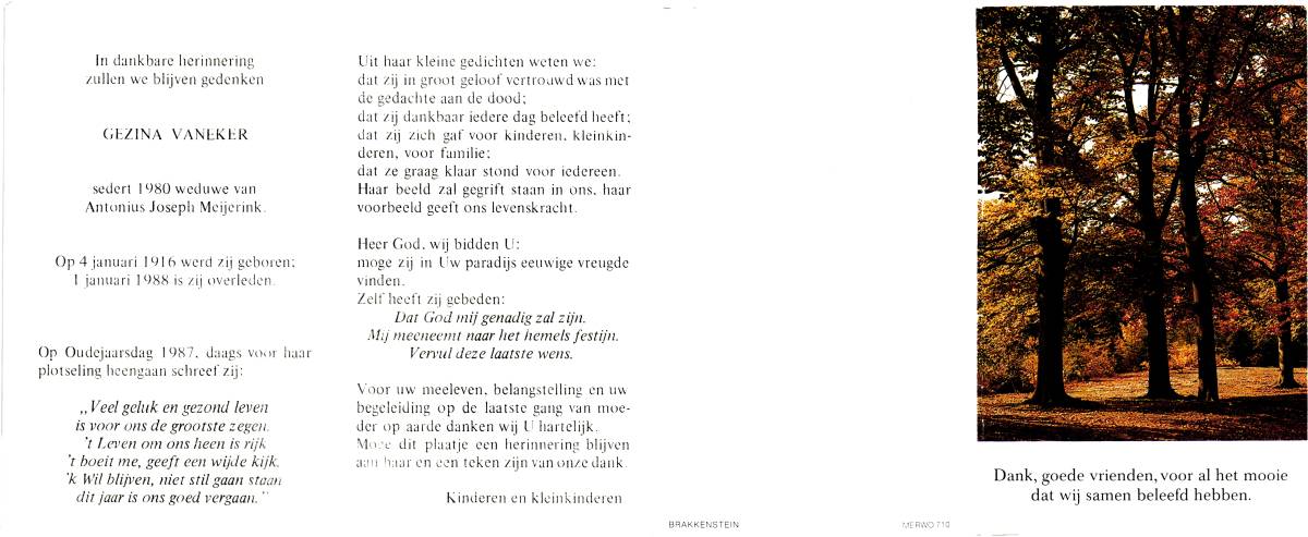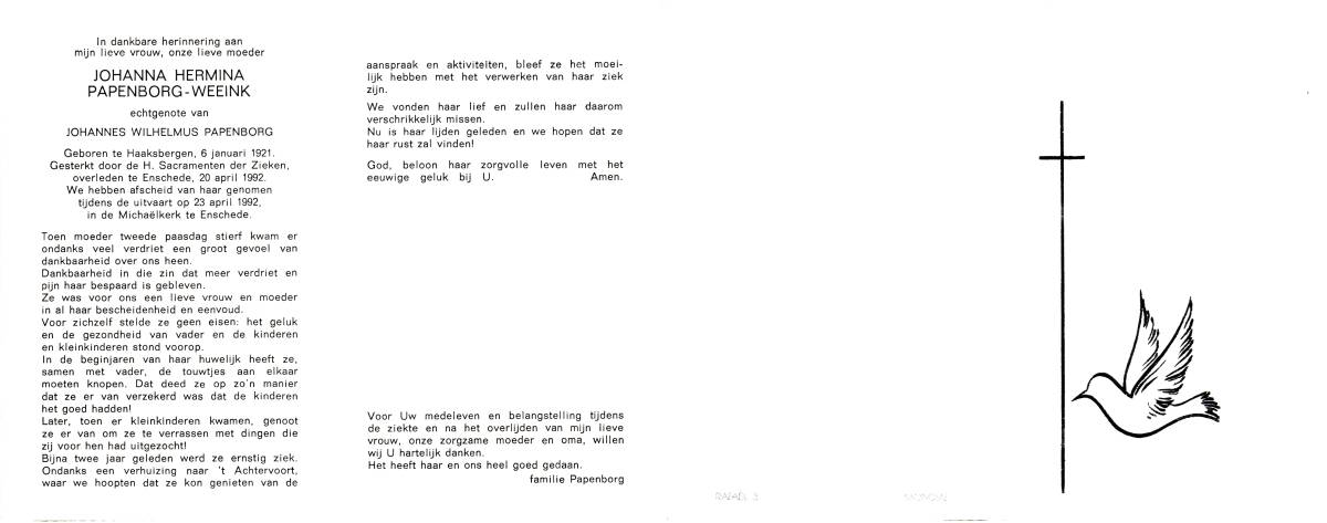 VARENBRINK, Berendina Johanna, geboren op 31-1-1906 te Lonneker, overleden op 19-11-1992 te Lonneker op 86-jarige leeftijd, gecremeerd op 24-11-1992 te Usselo.