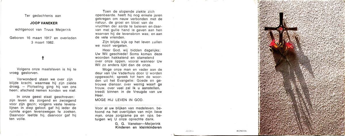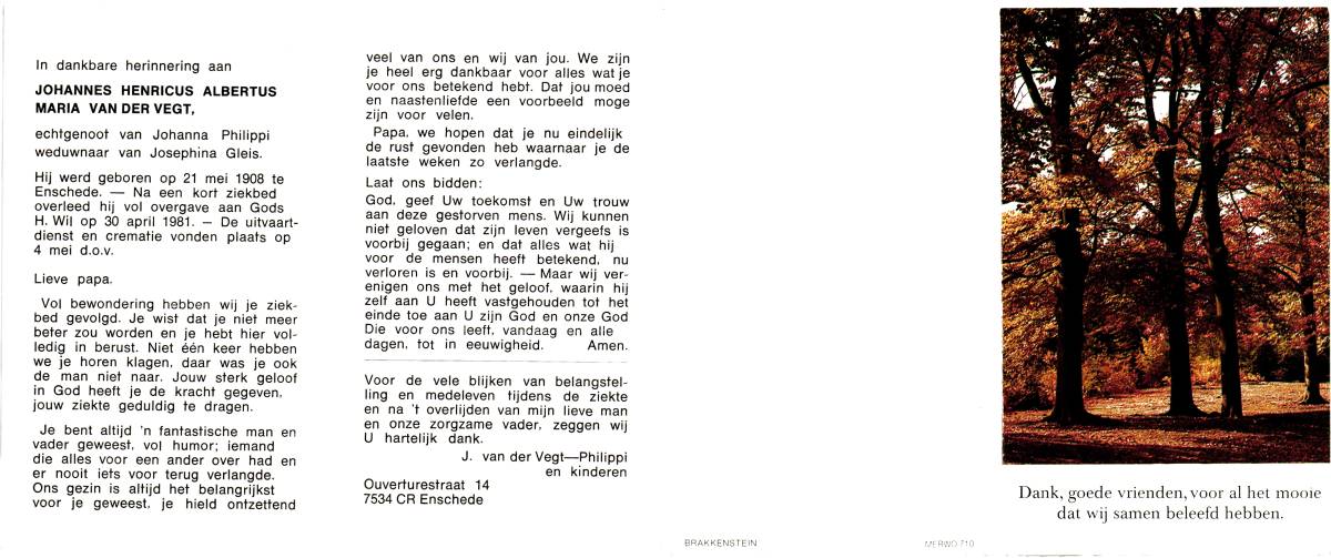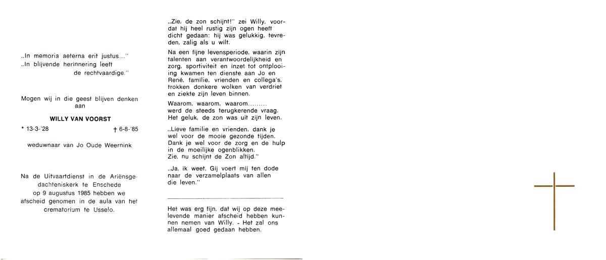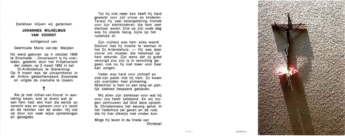 VOORST, van, Johannes Wilhelmus, geboren op 4-10-1906 te Enschede, overleden op 3-3-1982 te Glanerbrug op 75-jarige leeftijd, gecremeerd op 9-3-1982 te Usselo.