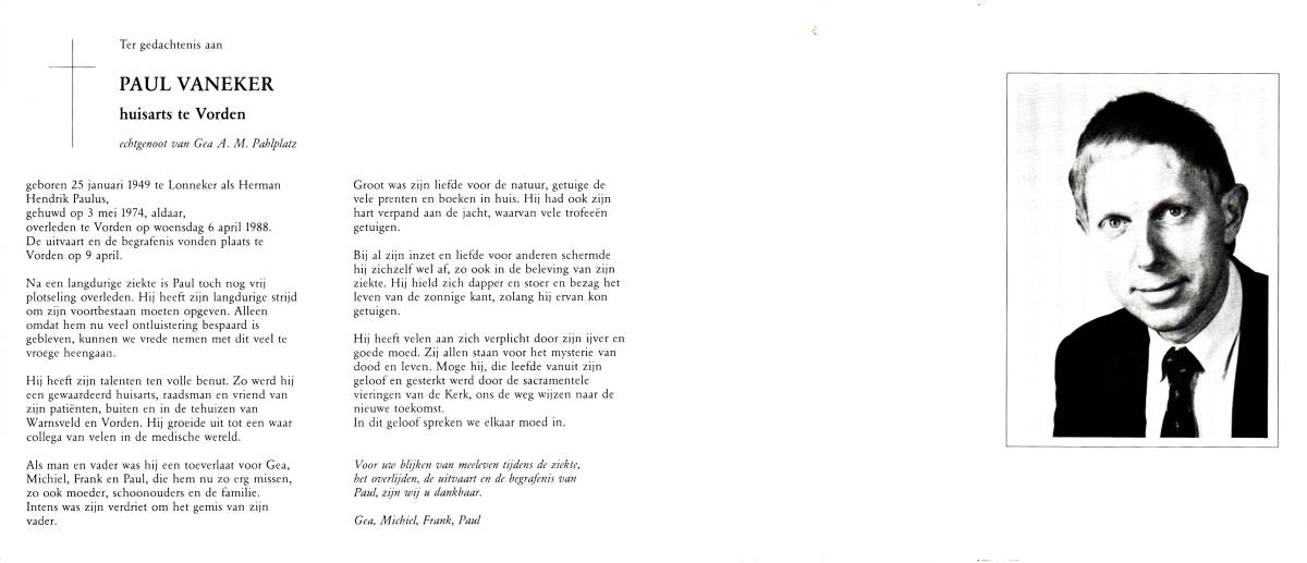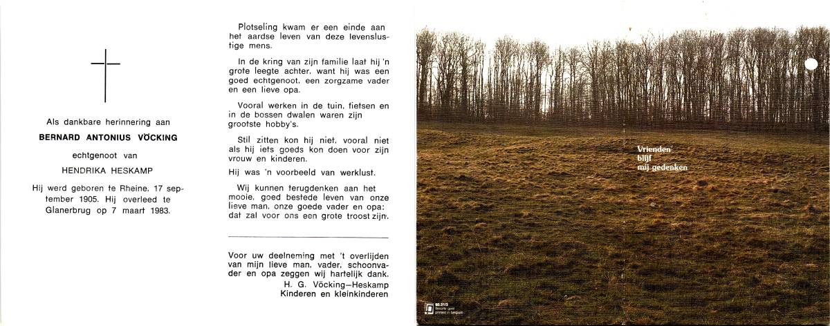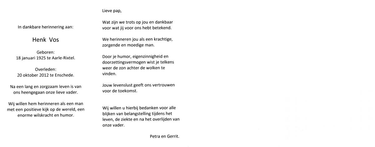 VOS, Hein, geboren op 23-3-1923 te Lonneker, overleden op 30-3-1978 te Lonneker op 55-jarige leeftijd, begraven op 3-4-1978 te Lonneker.