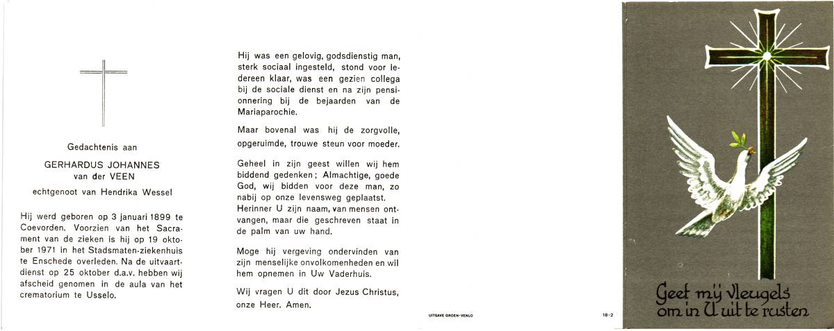 VEEN, van der, Gerhardus Johannes, geboren op 03-01-1899 te Coevorden, overleden op 19-10-1971 te Enschede, ziekenhuis op 72-jarige leeftijd, gecremeerd op 25-10-1971 te Usselo.