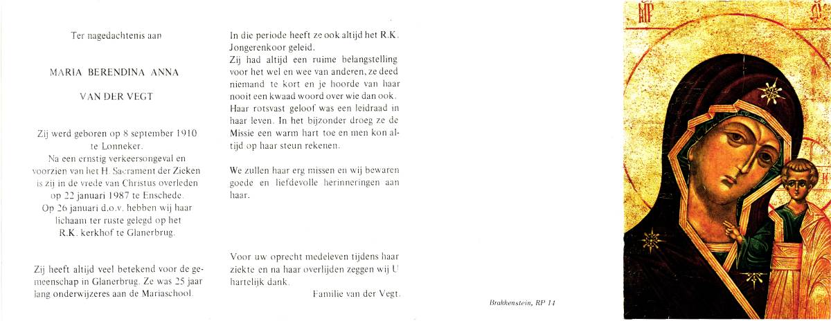 VEGT, van der, Maria Berendina Anna, geboren op 8-9-1910 te Lonneker, overleden op 22-1-1987 te Enschede op 76-jarige leeftijd, begraven op 26-1-1987 te Glanerbrug.