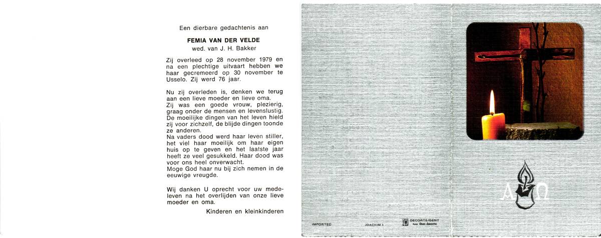 VELTHUIS, Aleida Theresia, geboren op 16-2-1931 te Zwolle, overleden op 25-1-1979 te Enschede op 47-jarige leeftijd, gecremeerd op 30-1-1979 te Usselo.