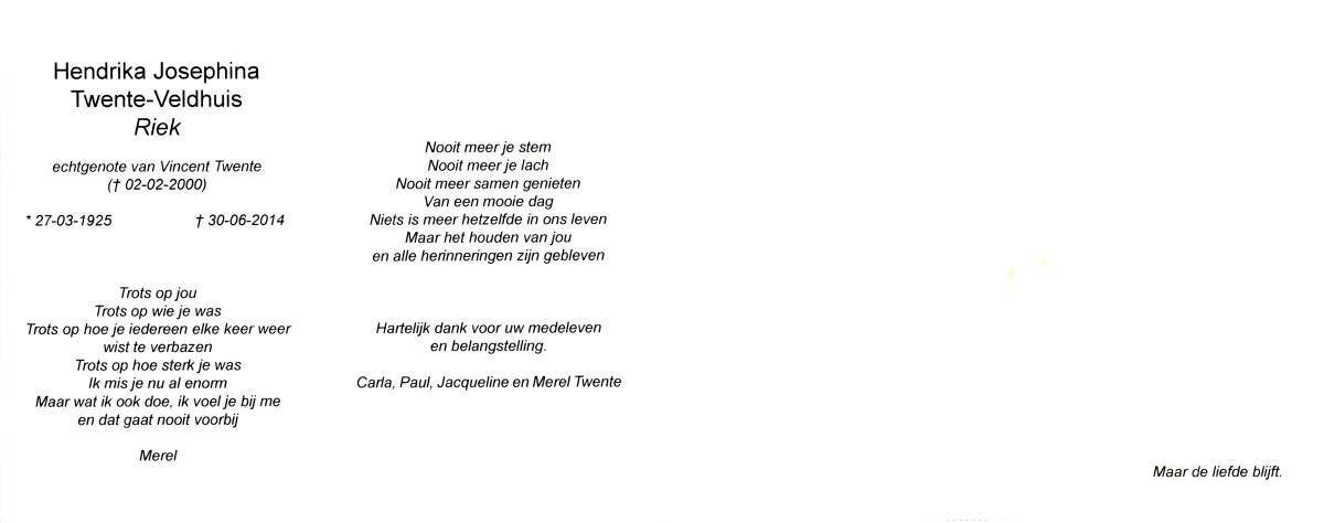 VELDMAN, Hendrika Johanna, geboren op 15-8-1904 te Hellendoorn, Nijverdal, overleden op 22-2-1982 te Hellendoorn op 77-jarige leeftijd, begraven op 25-2-1982 te Hellendoorn, Nijverdal, rk.