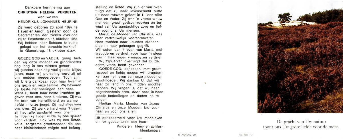 VERBETEN, Christina Helena, geboren op 20-04-1897 te Haven en Aerdt, overleden op 15-10-1984 te Enschede op 87-jarige leeftijd, begraven op 18-10-1984 te Glanerbrug.