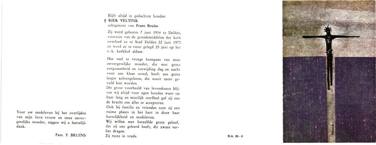 VEGER, Gezina Josephina, geboren op 13-1-1914 te Lonneker, overleden op 13-3-1972 te Lonneker op 58-jarige leeftijd, begraven op 16-3-1972 te Lonneker.