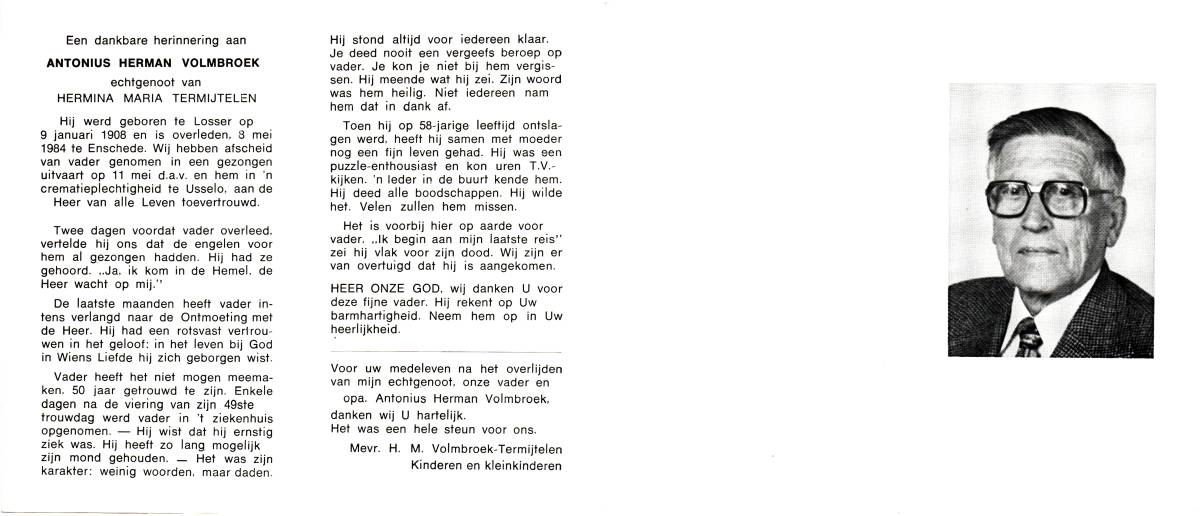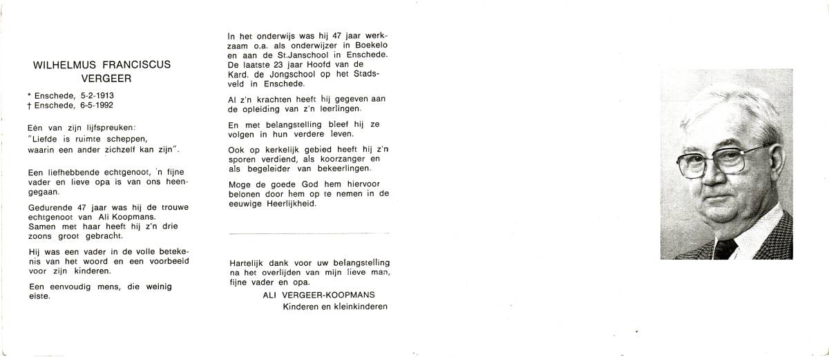 VERGERT, ten, Hendricus Johannes, geboren op 28-9-1911 te Lonneker, overleden op 14-3-1995 te Enschede, ziekenhuis op 83-jarige leeftijd, begraven op 17-3-1995 te Lonneker.