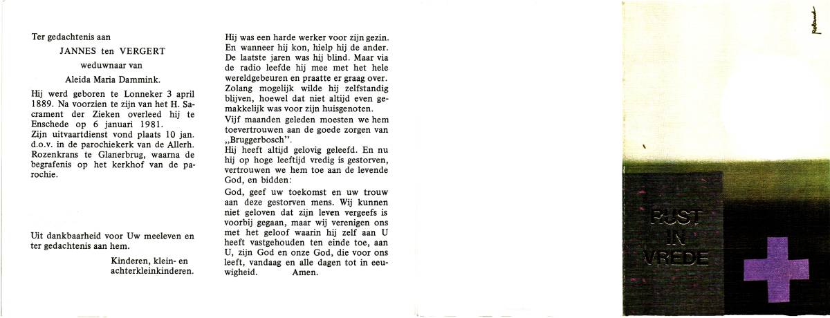 VERGERT, ten, Jannes, geboren op 03-04-1889 te Lonneker, overleden op 6-1-1981 te Enschede, ziekenhuis op 91-jarige leeftijd, begraven op 10-1-1981 te Glanerbrug.