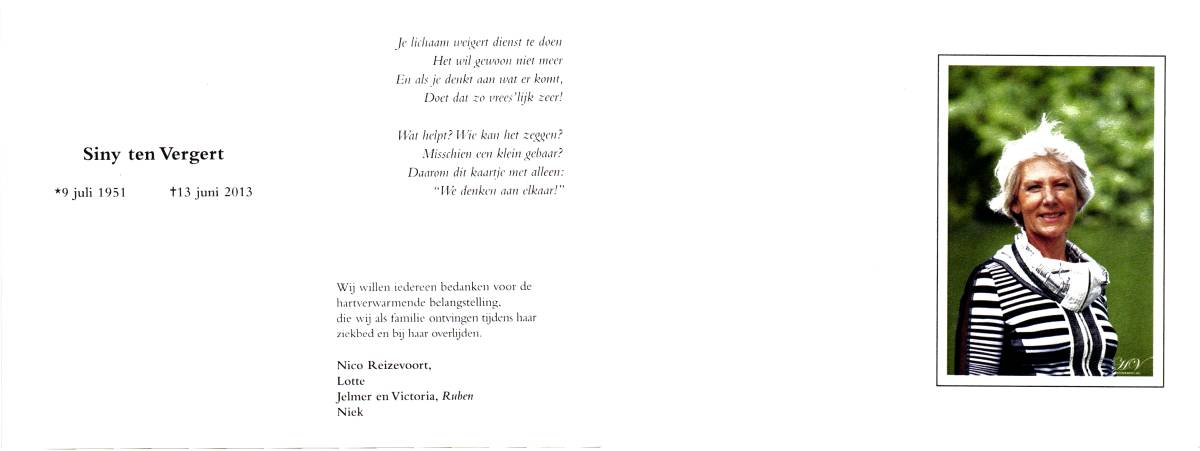 VOORDE, ten, Mineke, geboren op 21-5-1931 te Haaksbergen, overleden op 11-3-1987 te Haaksbergen op 55-jarige leeftijd, begraven op 14-3-1987 te Haaksbergen.