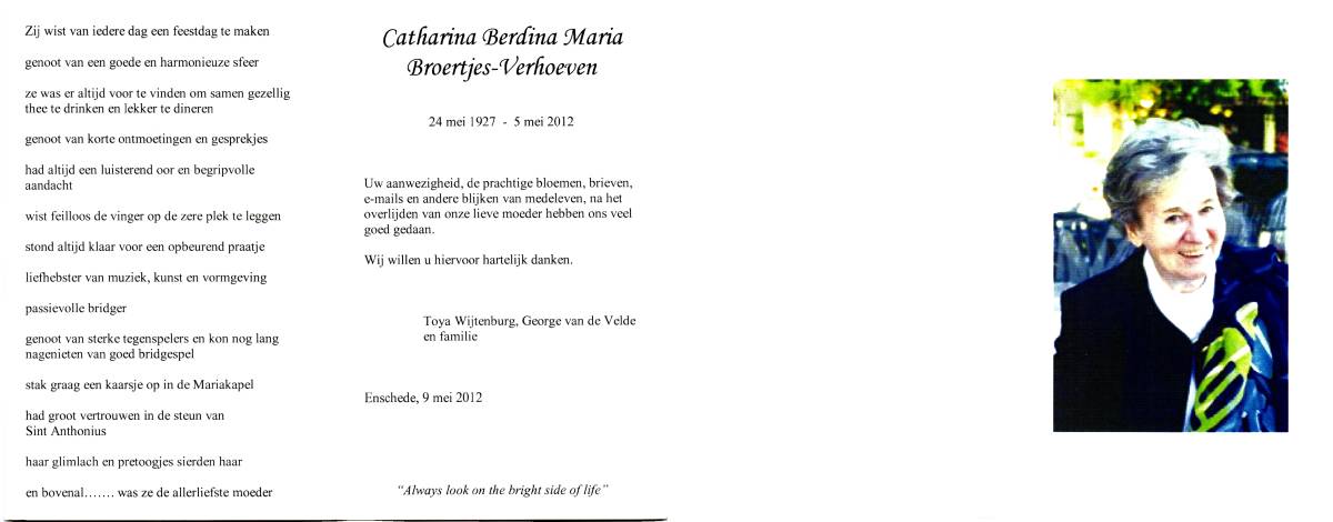 VOLKER, Alberta Johanna Maria, geboren op 8-5-1916 te Haaksbergen, overleden op 19-12-1990 te Hengelo op 74-jarige leeftijd, gecremeerd op 21-12-1990 te Usselo.
