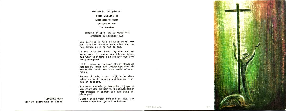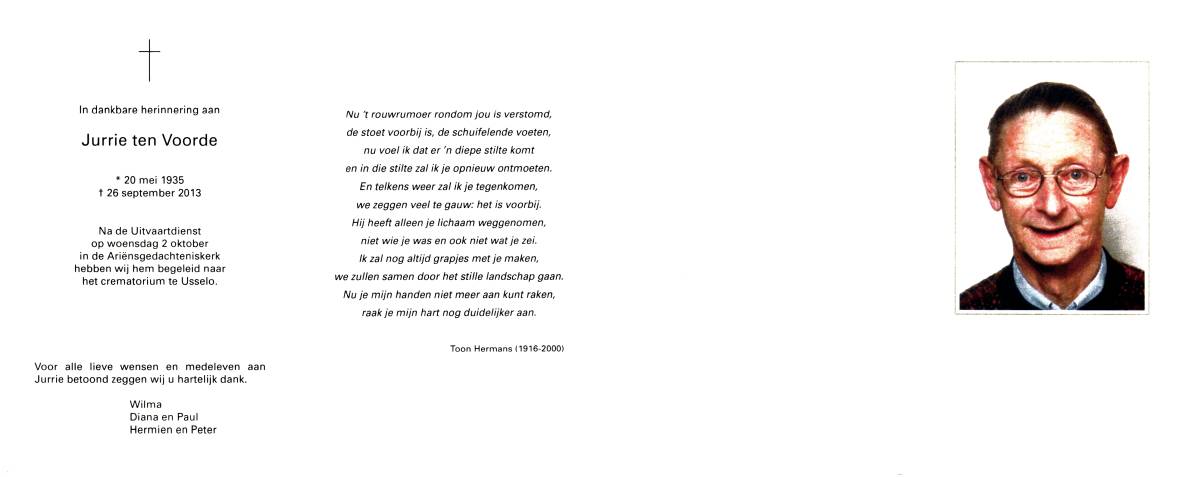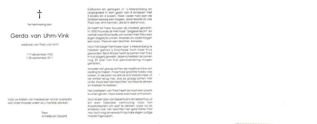 VOORDE, ten, Gerhard, geboren op 25-4-1929 te Haaksbergen, overleden op 15-1-1996 te Enschede, ziekenhuis op 66-jarige leeftijd, gecremeerd op 20-1-1996 te Usselo.