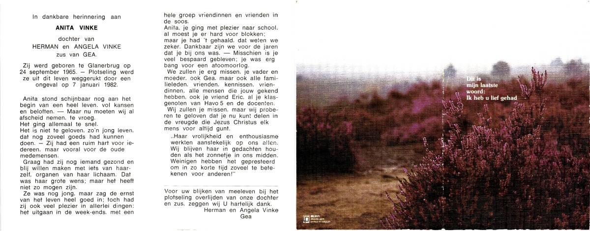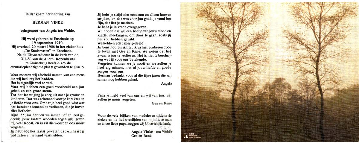 VINKE, Herman, geboren op 19-9-1940 te Enschede, overleden op 20-3-1986 te Enschede, ziekenhuis op 45-jarige leeftijd, gecremeerd te Usselo.
