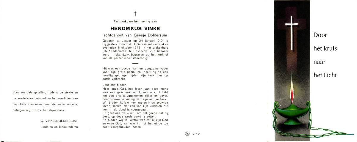 VINKE, Hendrikus, geboren op 24-1-1910 te Losser, overleden op 8-10-1975 te Enschede, ziekenhuis op 65-jarige leeftijd, begraven op 11-10-1975 te Glanerbrug.
