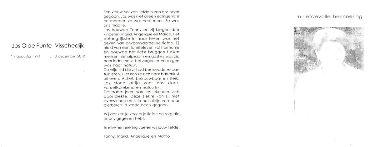 VISSCHEDIJK, Johanna Maria, geboren op 30-07-1875 te Weerselo, overleden op 8-10-1960 te Losser op 85-jarige leeftijd, begraven op 12-10-1960 te Losser.