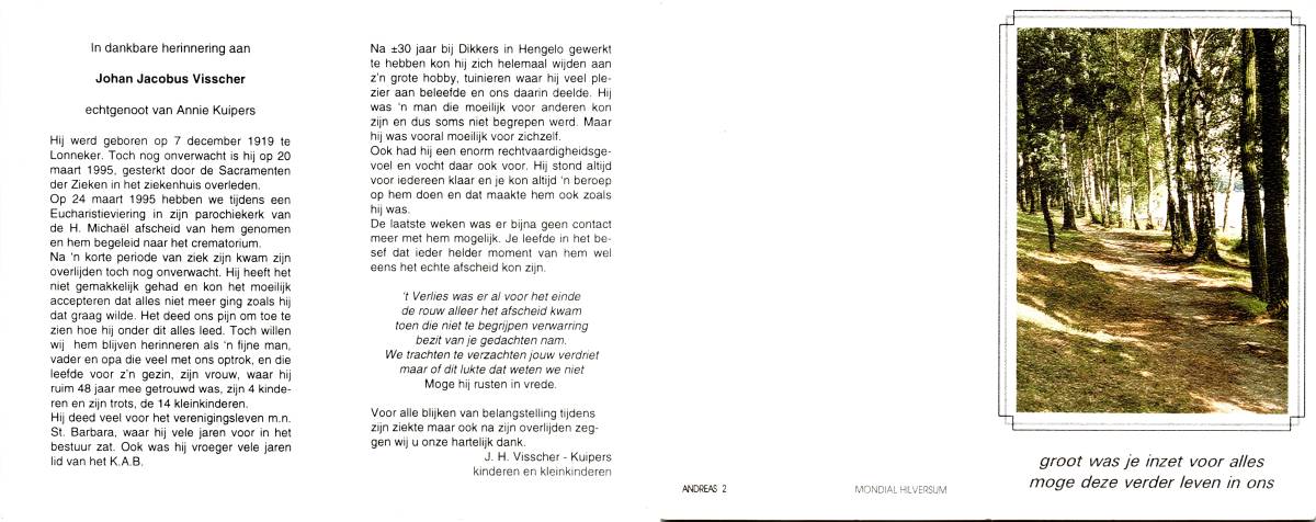 VISSCHER, Johan Jacobus, geboren op 7-12-1919 te Lonneker, overleden op 20-3-1995 te Enschede, ziekenhuis op 75-jarige leeftijd, gecremeerd op 24-3-1995 te Usselo.