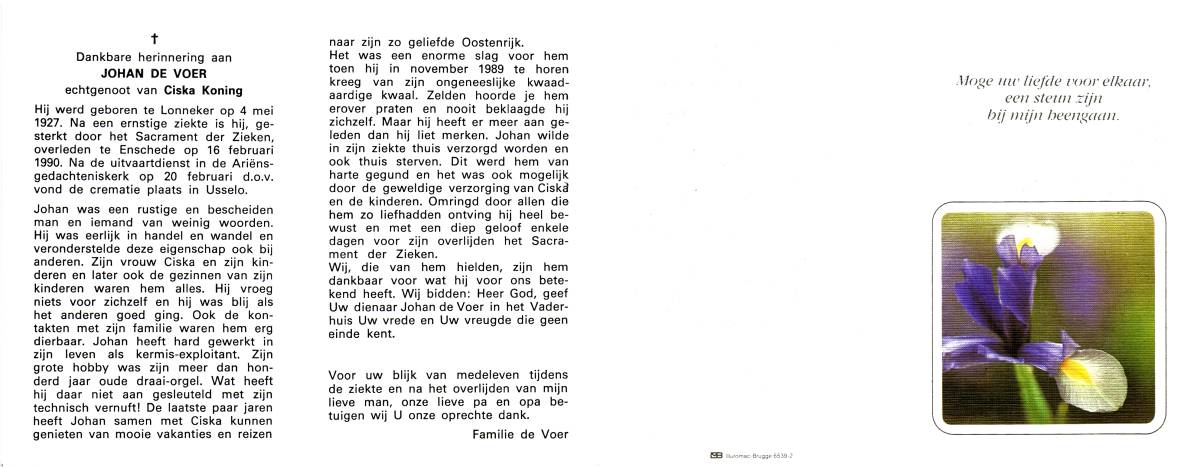 VOER, de, Johan, geboren op 4-5-1927 te Lonneker, overleden op 16-2-1990 te Enschede op 62-jarige leeftijd, gecremeerd op 20-2-1990 te Usselo.