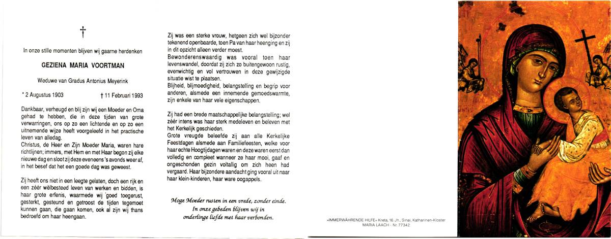VOORTMAN, Anna Gerharda Christina, geboren op 23-7-1910 te Enschede, overleden op 28-3-1992 op 81-jarige leeftijd, gecremeerd op 1-4-1992 te Usselo.