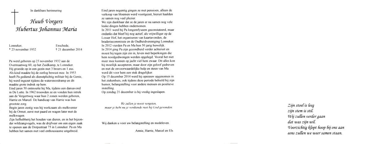 VORGERS, Johan Josephus, geboren op 4-8-1920 te Lonneker, overleden op 21-7-2002 op 81-jarige leeftijd.