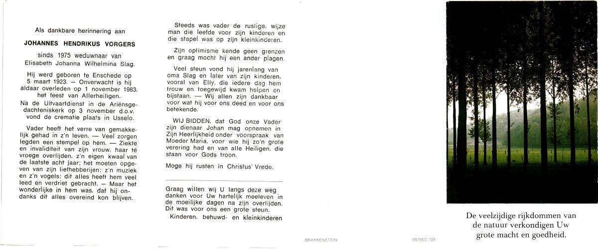 VORGERS, Johannes Hendrikus, geboren op 5-3-1923 te Enschede, overleden op 1-11-1983 te Enschede op 60-jarige leeftijd, gecremeerd op 3-11-1983 te Usselo.