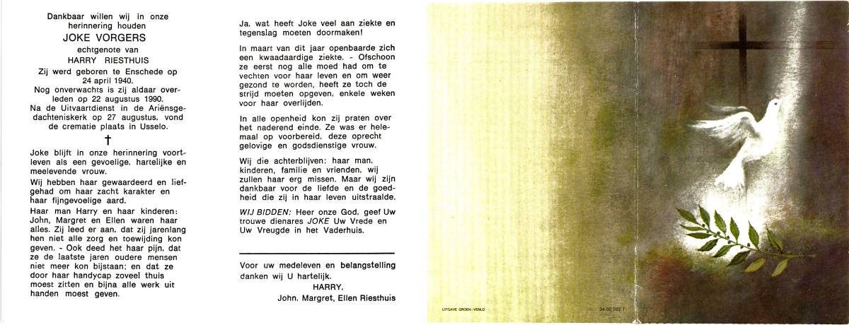 VORGERS, Joke, geboren op 24-4-1940 te Enschede, overleden op 22-8-1990 te Enschede op 50-jarige leeftijd, gecremeerd op 27-8-1990 te Usselo.