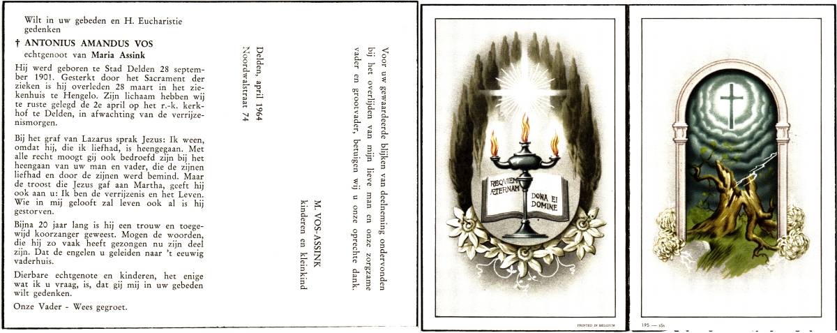 VOS, Antonius Amandus, geboren op 28-9-1901 te Delden, Stad, overleden op 28-3-1964 te Hengelo, ziekenhuis op 62-jarige leeftijd, begraven op 2-4-1964 te Delden.