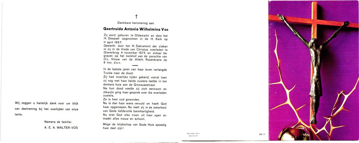 VOS, Geertruida Antonia Wilhelmina, geboren op 11-04-1887 te Oldemarkt, overleden op 4-11-1975 te Glanerbrug op 88-jarige leeftijd, begraven op 8-11-1975 te Glanerbrug.