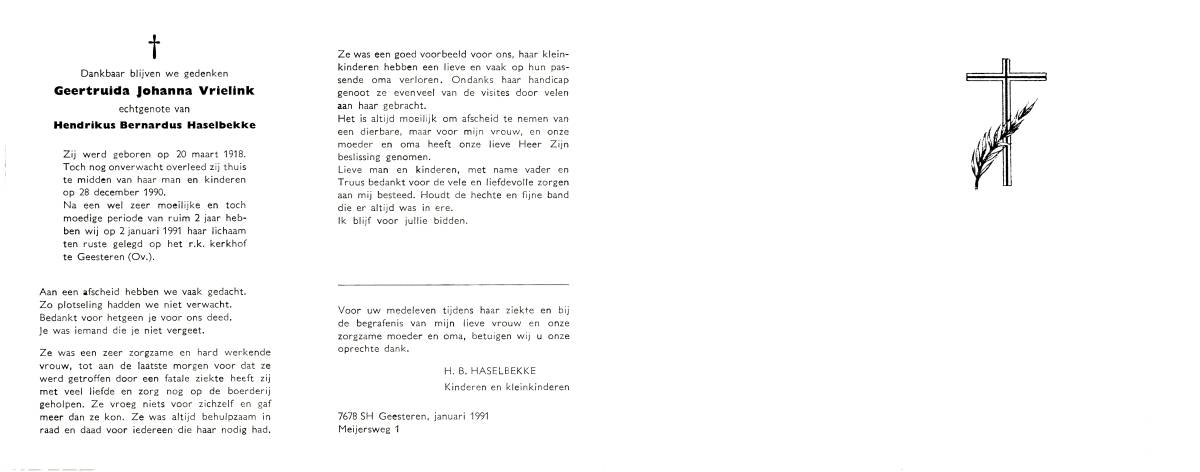 VERGERT, ten, Hendrika Albertha, geboren op 24-6-1907 te Lonneker, overleden op 1-12-1991 te Raalte op 84-jarige leeftijd, begraven op 5-12-1991 te Lonneker.