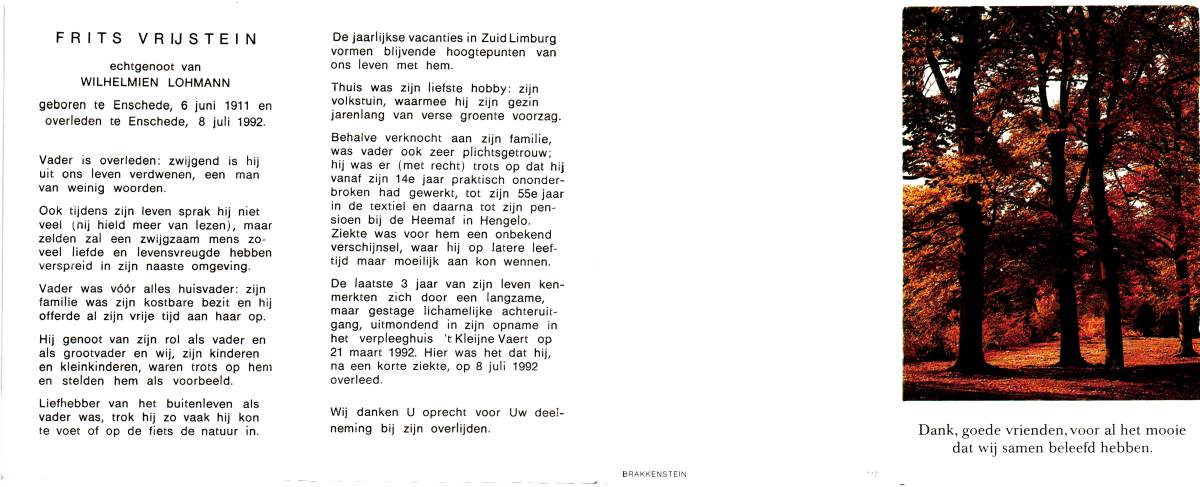 VRIJKOTTE, Hendrikus Johannes Gerhardus, geboren op 8-1-1908 te Losser, overleden op 22-10-1982 te Oldenzaal op 74-jarige leeftijd, gecremeerd op 25-10-1982 te Usselo.