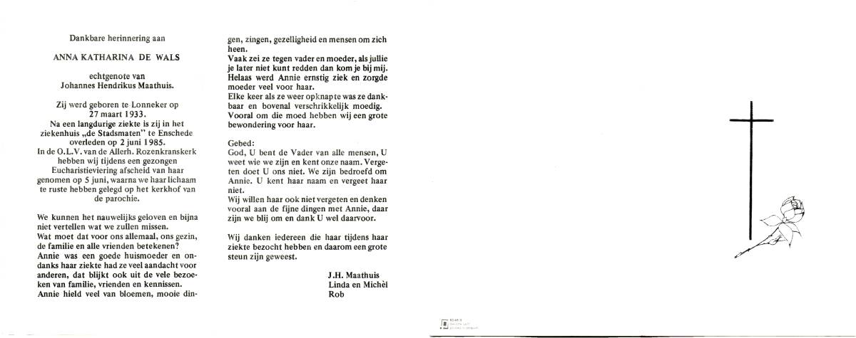 WALS, de, Anna Katharina, geboren op 27-3-1933 te Lonneker, overleden op 2-6-1985 te Enschede, ziekenhuis op 52-jarige leeftijd, begraven op 5-6-1985 te Glanerbrug.