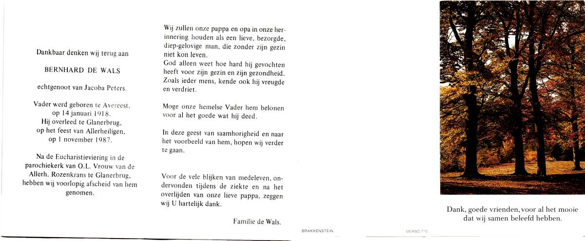 WALS, de, Bernhard, geboren op 14-1-1918 te Avereest, overleden op 1-11-1987 te Glanerbrug op 69-jarige leeftijd, begraven te Glanerbrug.