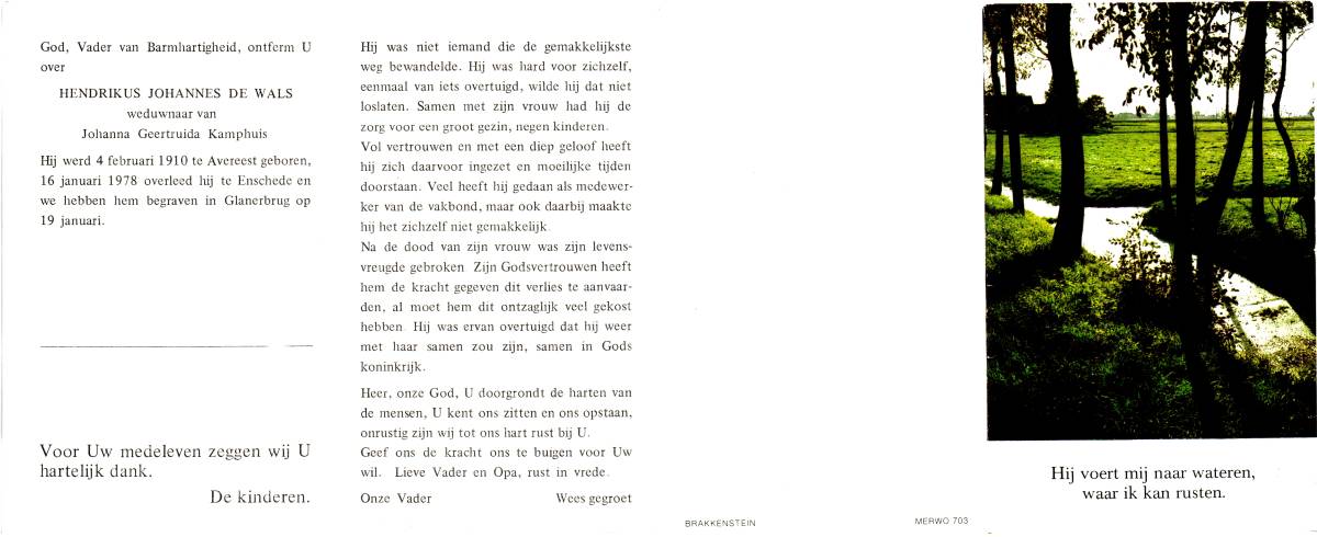WALS, de, Hendrikus Johannes, geboren op 4-2-1910 te Avereest, overleden op 16-1-1978 te Enschede op 67-jarige leeftijd, begraven op 19-1-1978 te Glanerbrug.